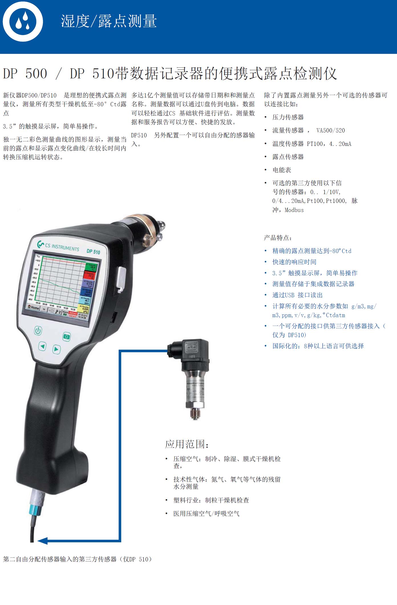 数据记录器的露点计DP 500是理想的便携服务露点测量仪, 适合各种类型的干燥机下可达 -80°Ctd。. 3.5“触摸屏的图形显示可容易操作, 彩色图表显示测量值很有特点. 适合测量当前的露点和露点曲线的图形指示/干燥机的开关行为在更长一段时间。
